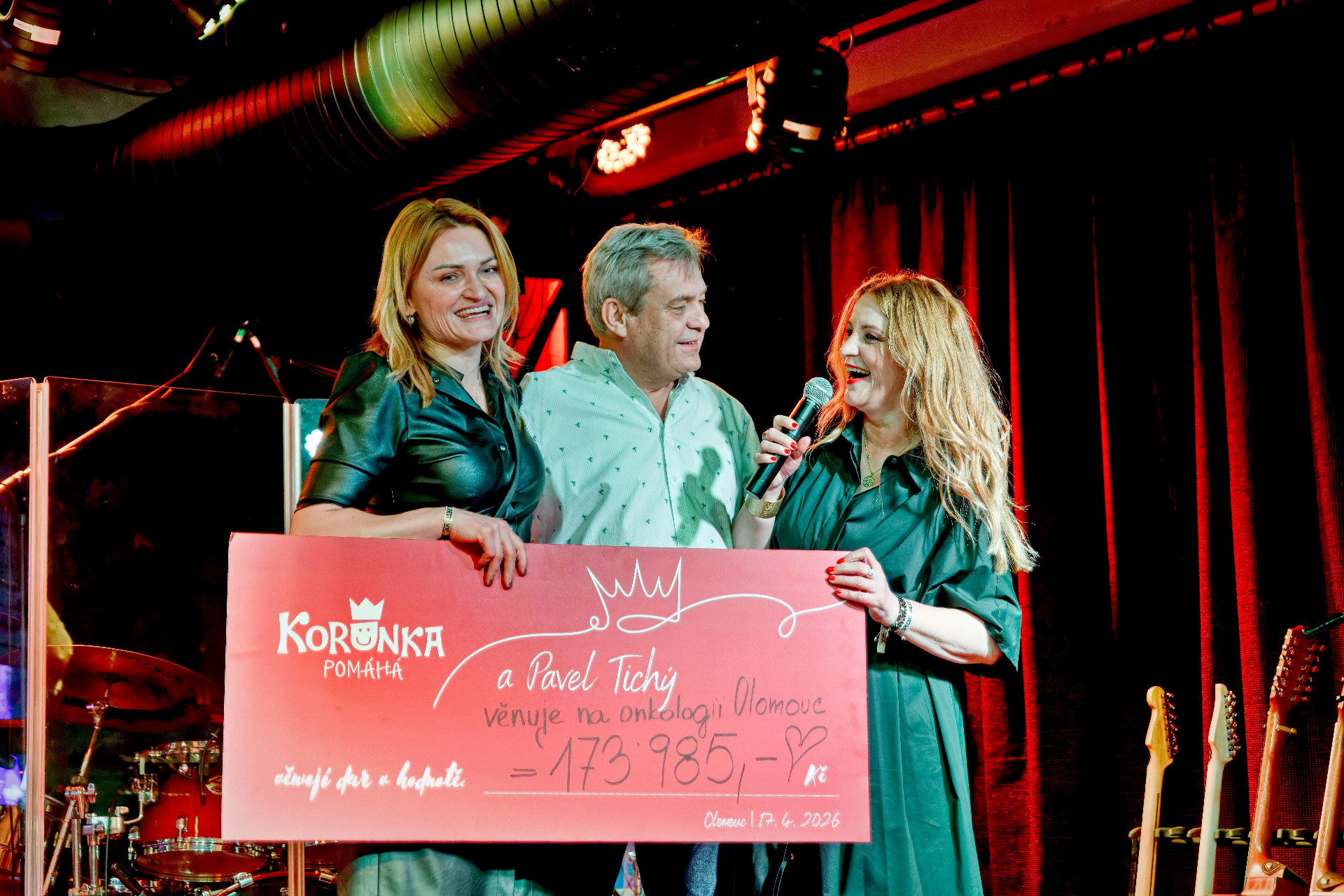 Vybraná suma byla nakonec rozdělena na dva šeky. První, na částku 173 985 korun, byl předán do rukou vedení Onkologické kliniky FNOL, a druhý, na částku 40 000 korun, věnoval Pavel Tichý Kamilovi, který sám pečuje o své dvě dcery, z nichž jedna je velmi vážně handicapovaná a neobejde se bez cizí pomoci. „Kamil se o obě své dcery stará s velkou láskou a pečlivostí. Velmi mě těší, že jsme mu mohli všichni přispět v nelehké životní situaci a podpořit léčbu jeho dcery Gabriely,“ dodal Pavel Tichý, který dlouhodobě podporuje charitativní projekt KORUNKA POMÁHÁ.