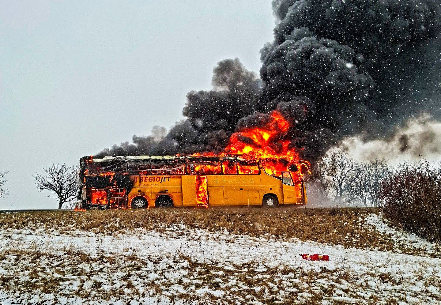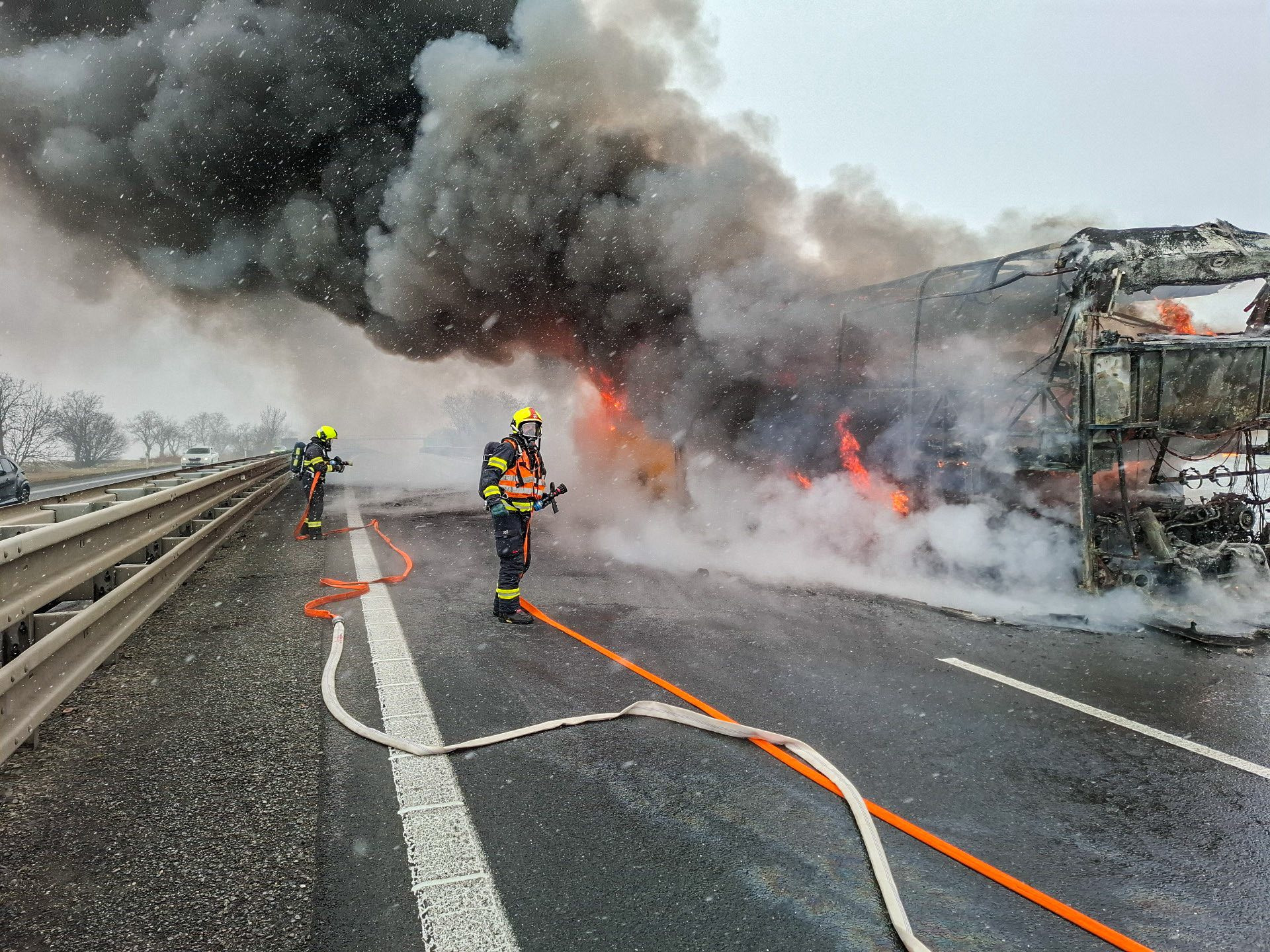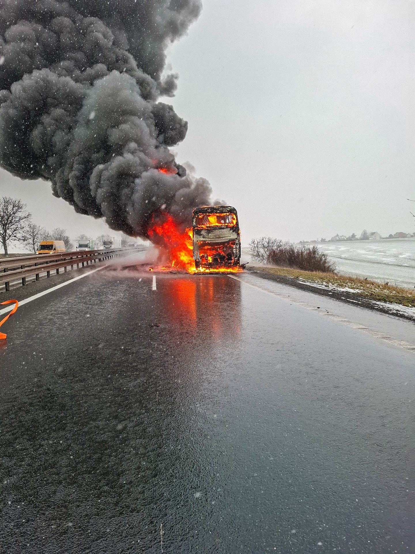 Velký požár dálkového autobusu likvidují hasiči na dálnici D46 u Vranovic-Kelčic ve směru na Vyškov. Na dálnici byl kvůli tomu ve směru na Brno dočasně zastaven provoz. Evakuovaní lidí čekají na odvoz.