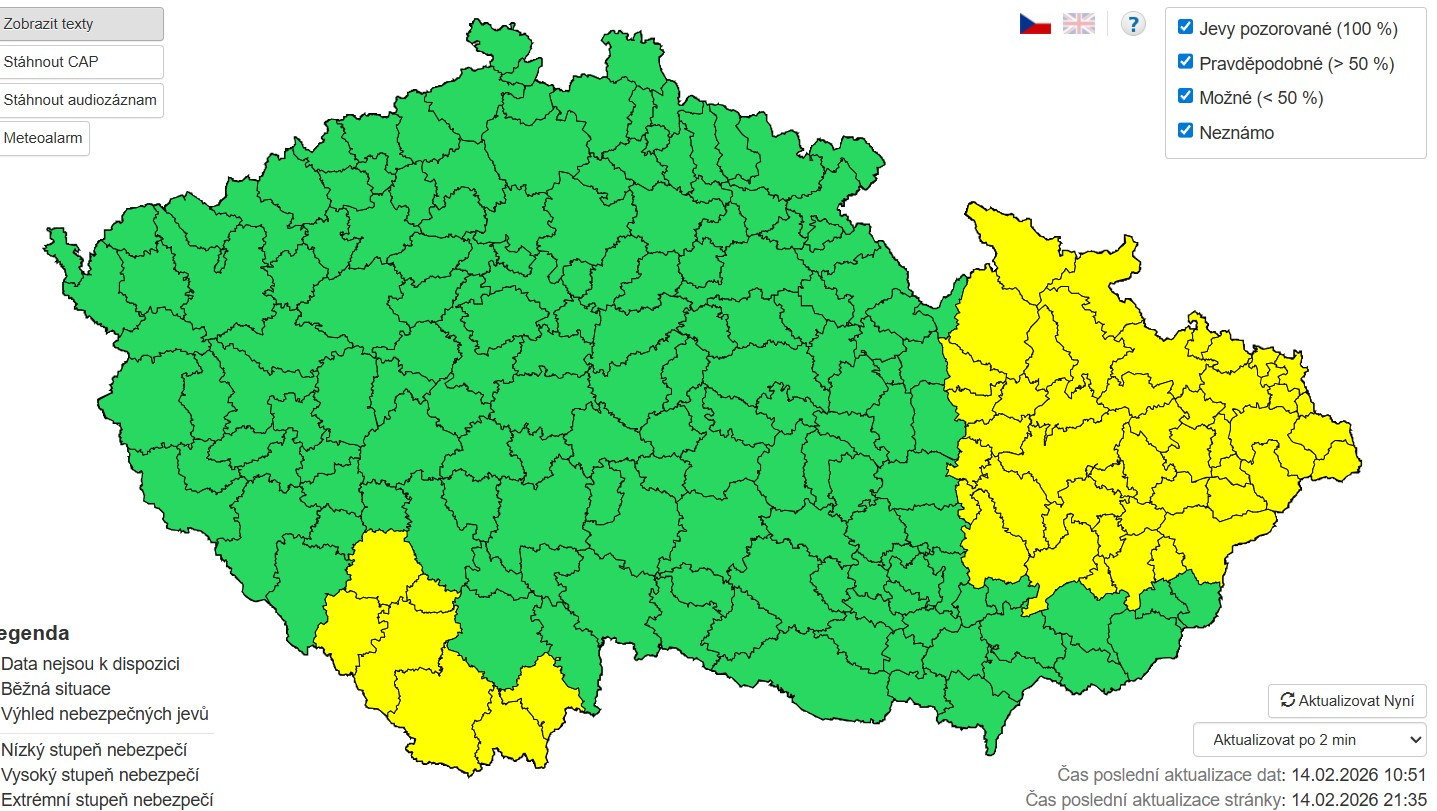 V době od sobotní půlnoci do neděle 15. února odpoledne je v platnosti výstraha před tvorbou sněhových jazyků. To s sebou nese zhoršení sjízdnosti komunikací, některé vozovky mohou být nesjízdné. Při řízení bude nutná zvýšená opatrnost. Doporučuje se při cestování sledovat dopravní zpravodajství.